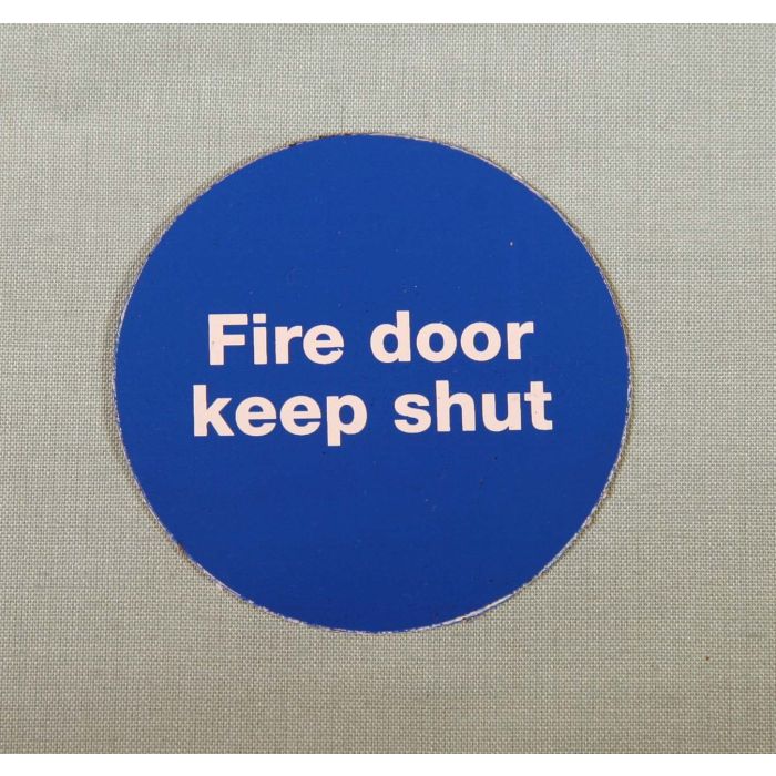 Fire Door Keep Shut 60Mm Dia White Letters On Blue Background Plastic Self Adhesive Sign