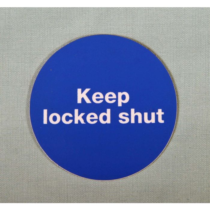 Keep Locked Shut 60Mm Dia White Letters On Blue Background Plastic Self Adhesive Sign